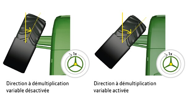 Les virages en bout de champ ou les manœuvres dans des espaces restreints demandent moins de mouvements de bras et d’effort de braquage. Une action plus rapide sur le volant de direction augmente le flux hydraulique et fait réagir les pneus plus rapidement. Diriger un tracteur devient extraordinairement plus facile.