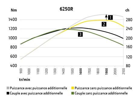 La fonction de gestion de puissance intelligente (1) fournit jusqu’à 40 ch supplémentaires pour les applications de transport ou à la prise de force. La puissance maximale (2) et le couple maximal (3) sont atteints à 1 900 et 1 600 tr/min respectivement, afin de garantir une réponse optimale avec une faible consommation de carburant.*