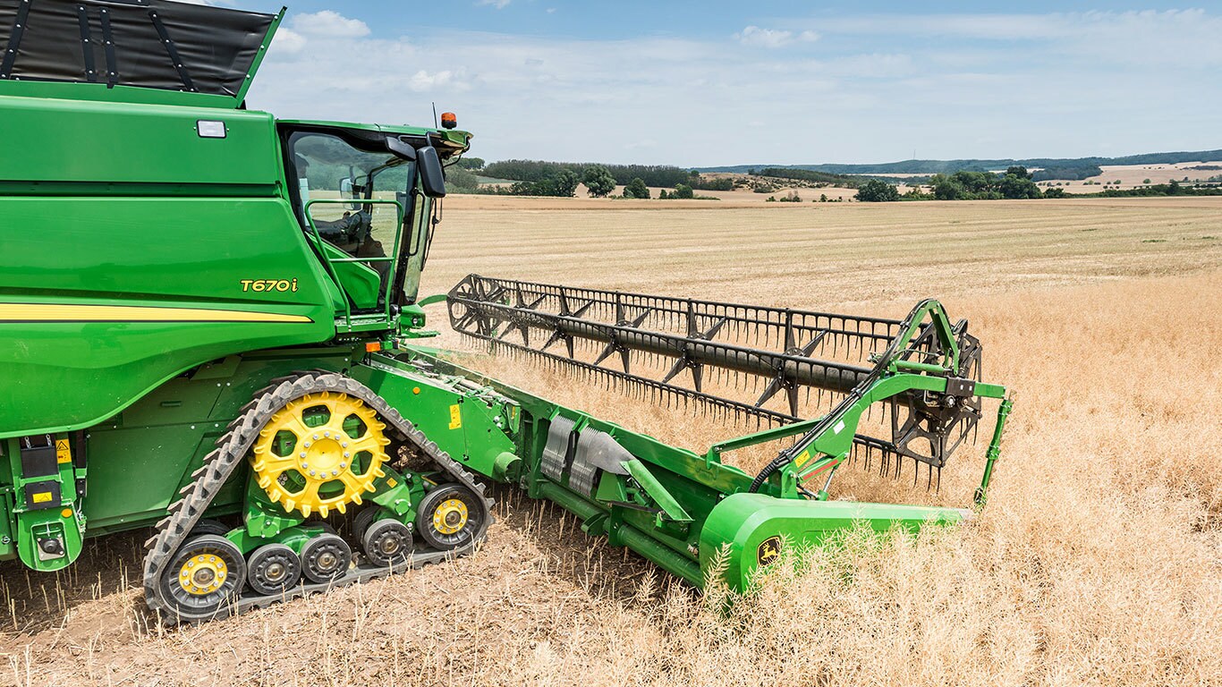 Dans des conditions difficiles comme les récoltes couchées, les pois ou les graminées, l’unité de récolte 700PF avec transport actif de la récolte dans la vis d’alimentation empêche l’accumulation de matière à l’avant de l’unité de récolte.