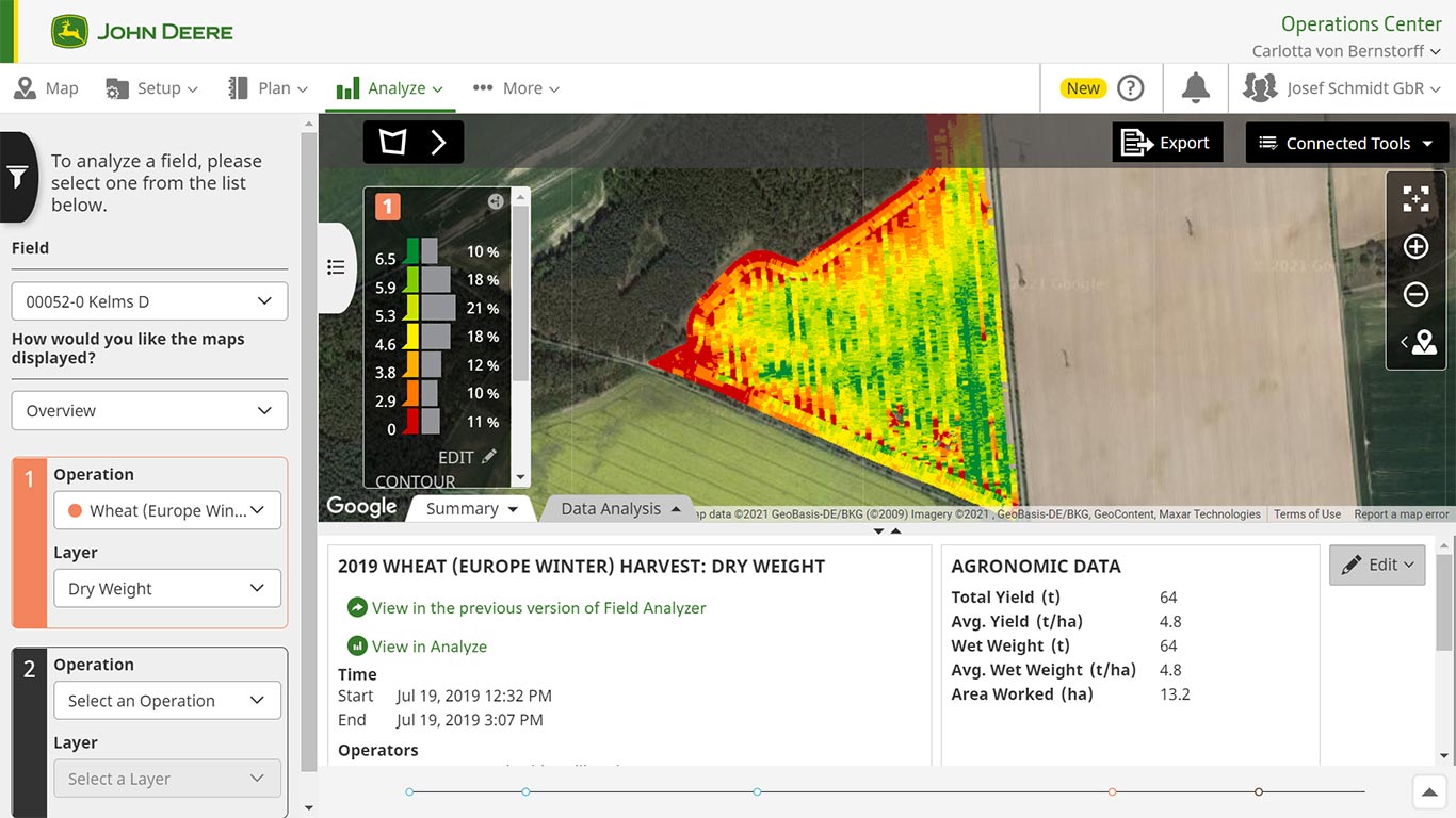 Toutes les données importées peuvent servir à créer des rapports ou à analyser les données afin d’encore améliorer et de mieux comprendre les résultats. Les données peuvent également servir à optimiser la planification de la prochaine saison des récoltes.