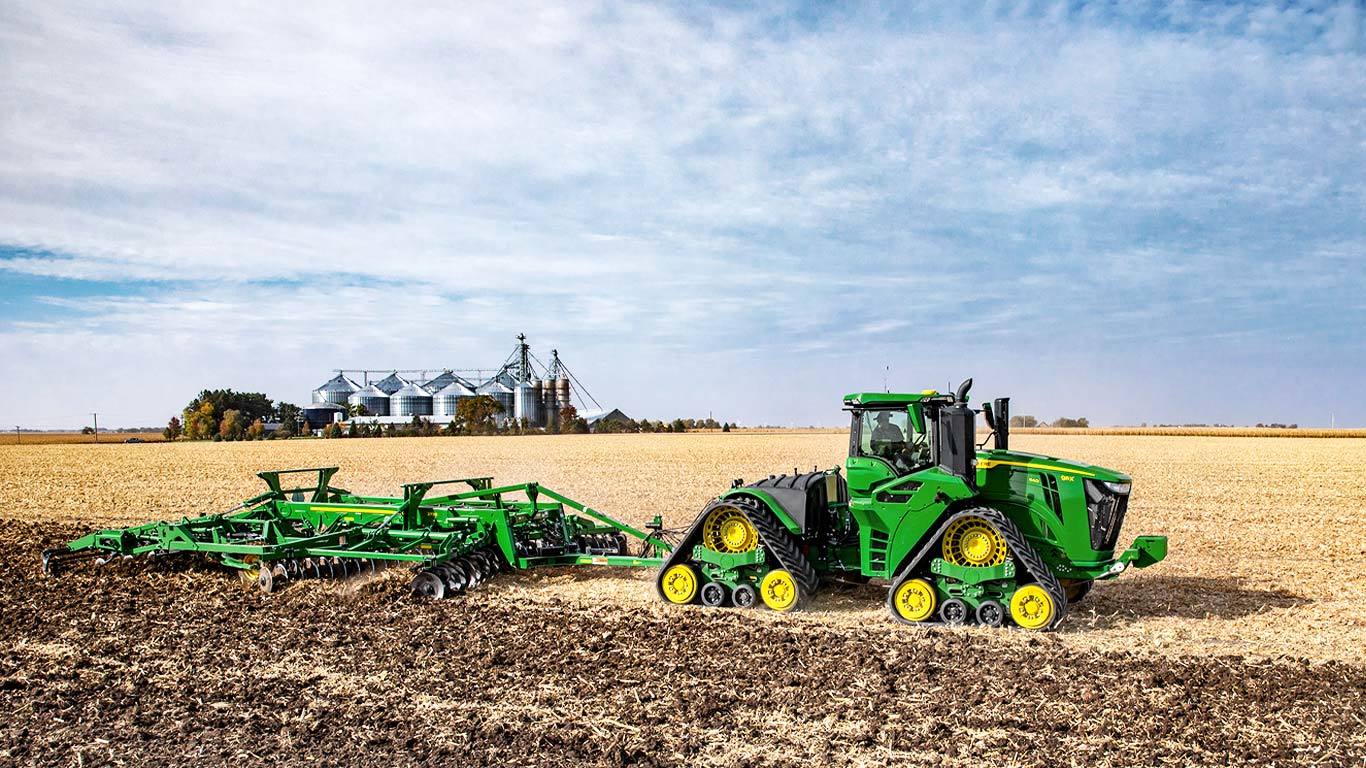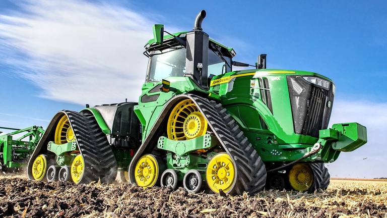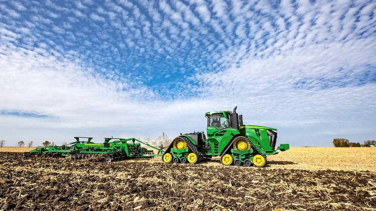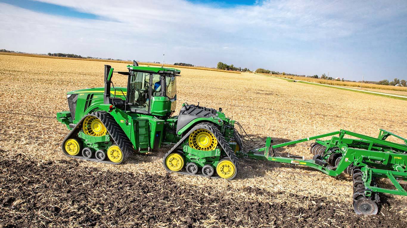 Le 9RX propose plus de puissance et, grâce à ses nouvelles options de lestage, il dispose également d’une plus grande capacité de traction. Son empreinte totale atteint jusqu’à 119 % de plus que les roues et représente 42 % de plus que les chenilles jumelées. La traction est pleinement maintenue, même en cas de virages sous charge et elle produit des risbermes minimes aux extrémités des rangs. L’étroite largeur de transport, la vitesse maximum sur route de 40 km/h et la suspension de la cabine sur 4 postes facilitent le déplacement entre les champs.